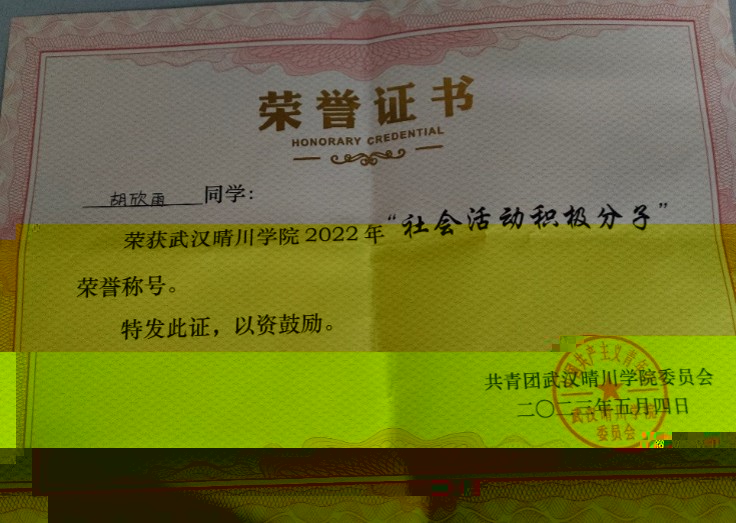 (注釋:榮獲“社會活動積極分子”榮譽稱号)