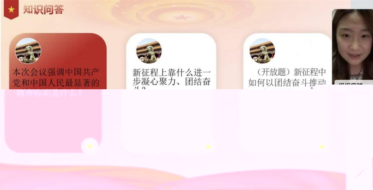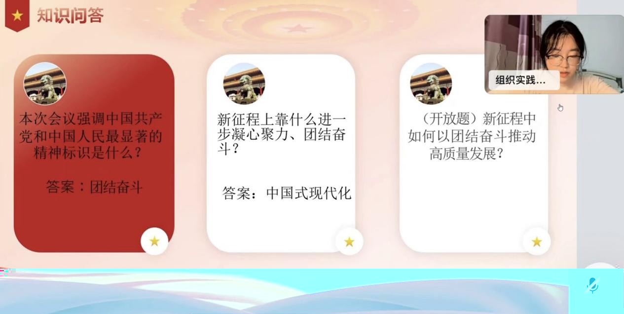 随着理論學習的結束,活動進入知識問答階段。主持人圍繞此次黨日活動的内容,提出了“本次會議強調中國共産黨和中國人民最顯著的精神标識是什麼”等問題,以問答的形式檢驗學習成果。王柯等成員積極參與問答,并且準确地回答了相關問題。在開放題讨論交流過程中,張運龍等成員從自身實際出發,結合所學理論知識,從多個方面回答了問題。