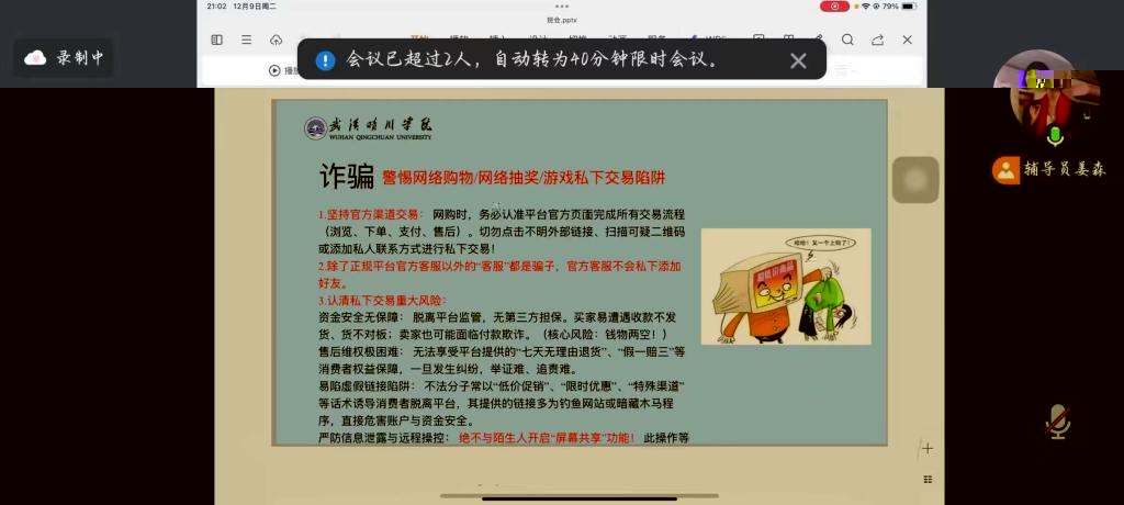 姜森老師為23級金管學生在線上共同開展開學第一周班會。導員姜森向同學們圍繞專升本報考策略與動員、畢業事務與就業安排、防詐騙及心理健康安全教育三大核心展開,為同學們最後一學期的學業、實習與發展明晰重點。